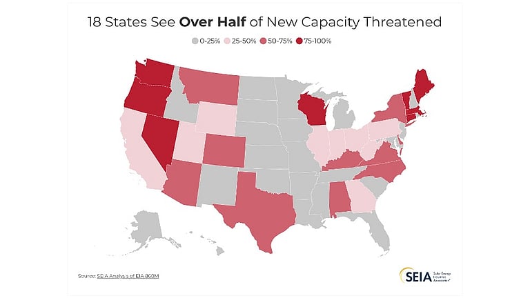 Half of all planned electricity generation capacity in 18 US states could vanish under stricter federal oversight as solar and storage projects face heightened scrutiny and permitting challenges, says SEIA. (Photo Credit: SEIA)